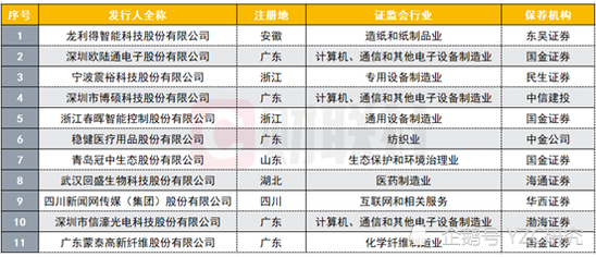 根据深交所官网,第二批受理企业共计11家企业,分别是:龙利得智能科技股份有限公司、深圳欧陆通电子股份有限公司、宁波震裕科技股份有限公司、深圳市博硕科技股份有限公司、浙江春晖智能控制股份有限公司、稳健医疗用品股份有限公司、青岛冠中生态股份有限公司、武汉回盛生物科技股份有限公司、四川新闻网传媒(集团)股份有限公司、深圳市信濠光电股份有限公司、广东蒙泰高新纤维股份有限公司。这11家企业共分布在6个地区、来自9个行业。具体信息如下表所示。