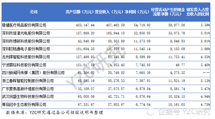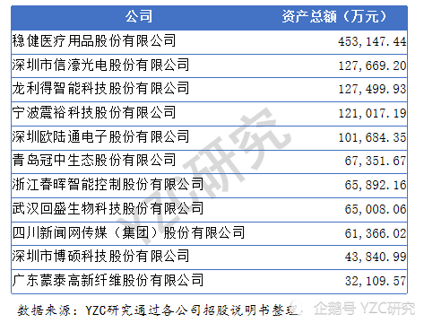资产情况:11家公司的总资产在3.2亿至45.3亿之间。其中,总资产最高的是稳健医疗用品股份有限公司,总资产最低的是广东蒙泰高新纤维股份有限公司。