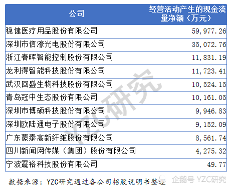 经营活动现金流:11家公司中经营活动现金流除宁波震裕科技股份有限公司不足50万元外,其他公司均超过4000万元,稳健医疗用品股份有限公司的经营现金流达到约6亿元。
