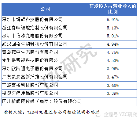 研发投入占比:除一家公司无研发投入占比数据外,10家公司的研发投入占比在3%-6%之间,深圳市博硕科技股份有限公司研发投入占比最高,达到5.91%。