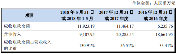 苏州国宇应收账款占资产总额比例过半。2016年末、2017年末和2018年5月末,苏州国宇应收账款账面余额分别为0.62亿元、1.15亿元、1.19亿元,占各期末资产总额的比例分别为32.60%、51.04%、53.64%。